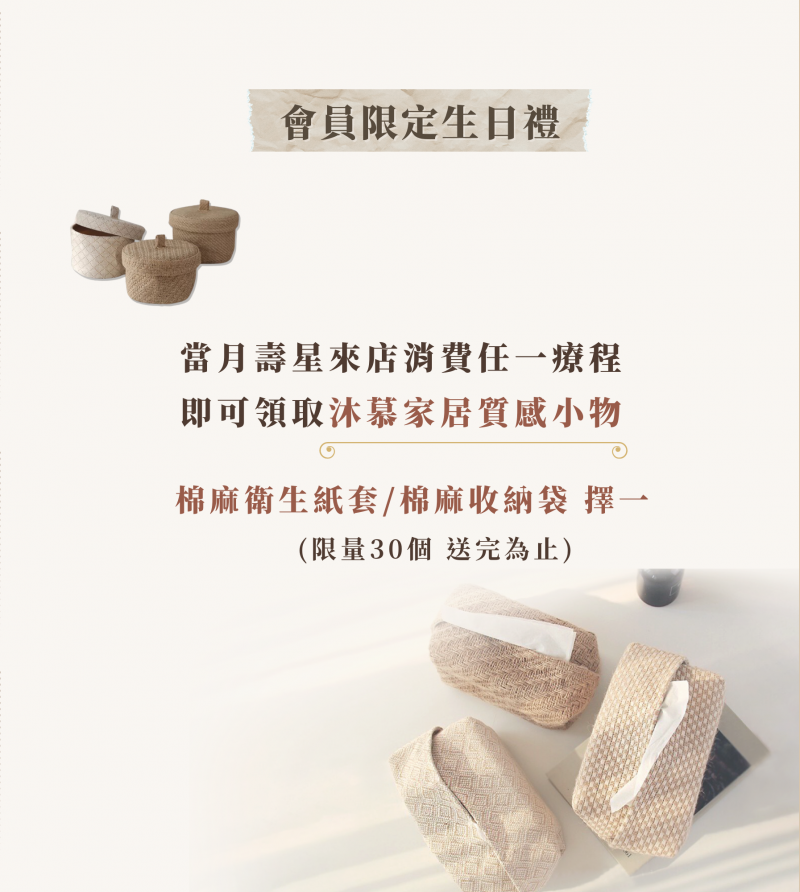 5月2日起到5月30日, 當月壽星來店消費任一療程即可領取