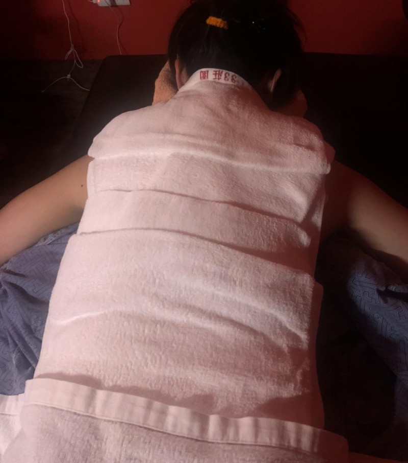 8條熱毛完整敷蓋背部,一邊熱敷一邊紓緩按壓。